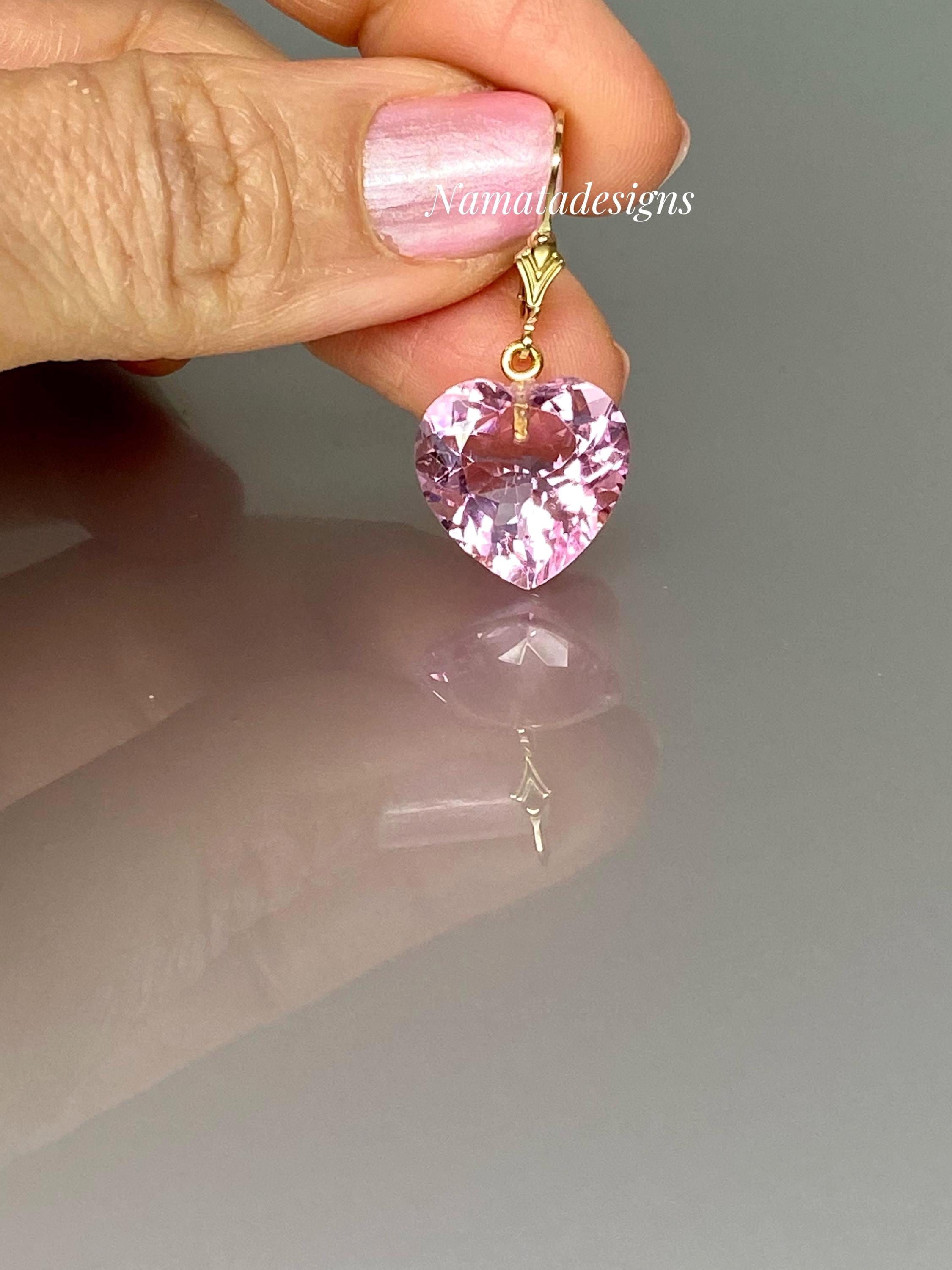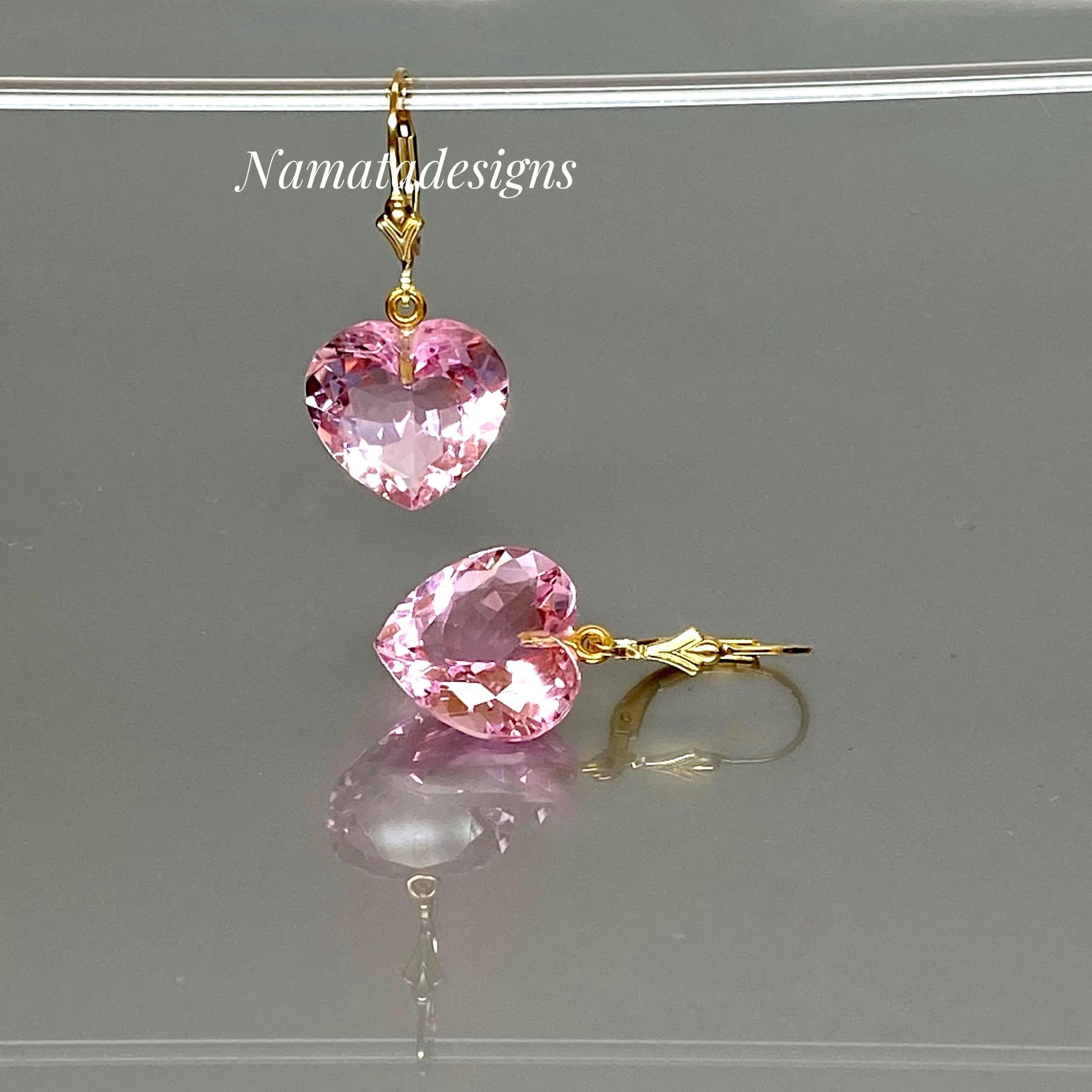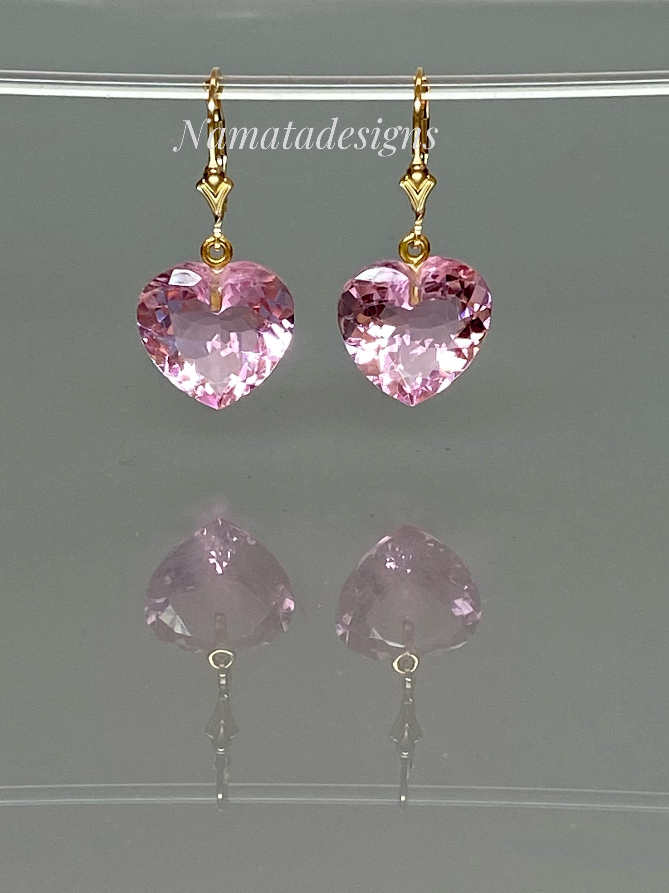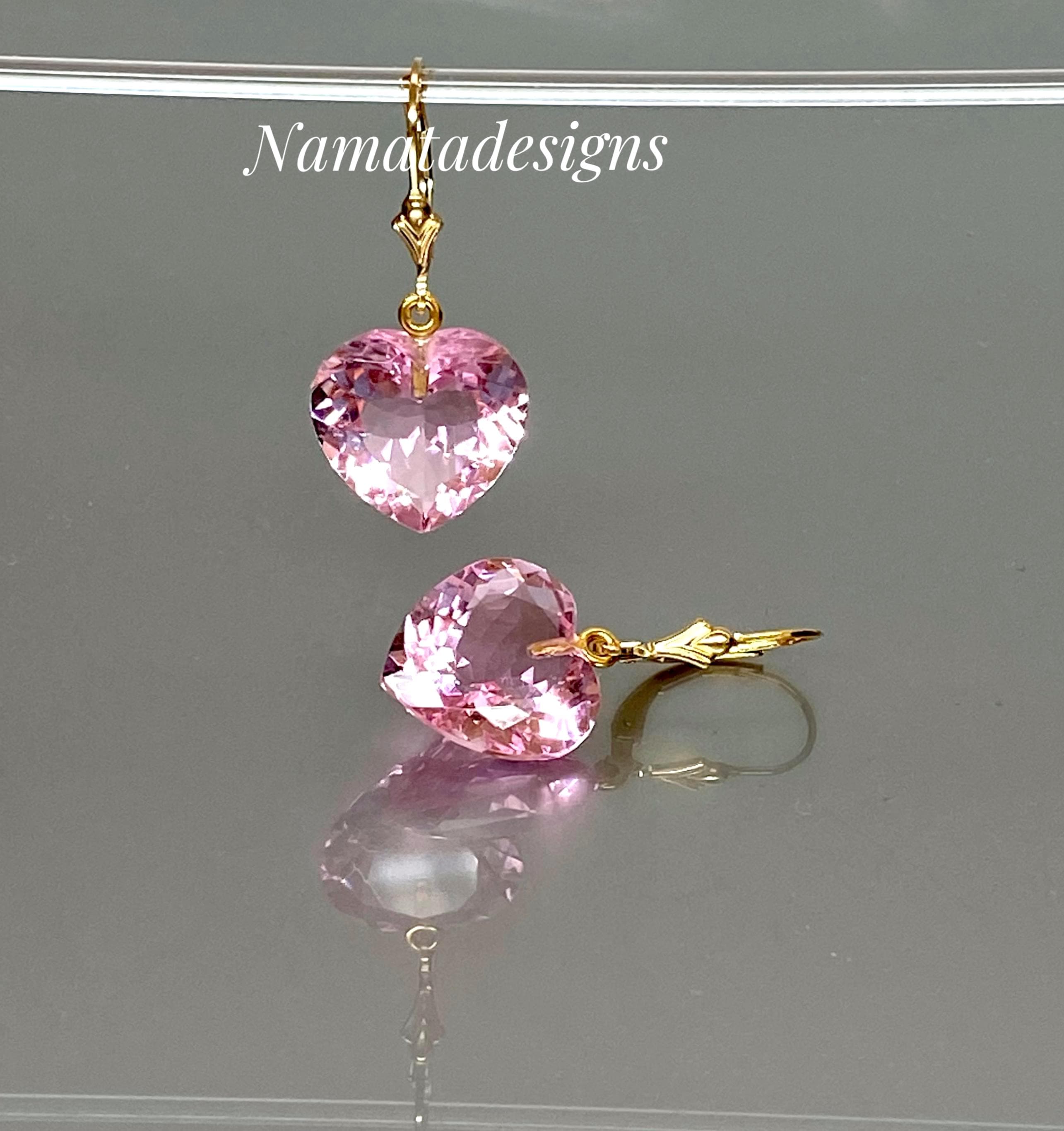 Gorgeous sparkly pink topaz heart earrings. The Faceted heart shape drops are flawless and have a beautiful clear baby pink color. The drops are attached to secure 24k gold-vermeil lever backs/ 24k gold vermeil ear wires. The earrings are elegant and have a luxurious look.